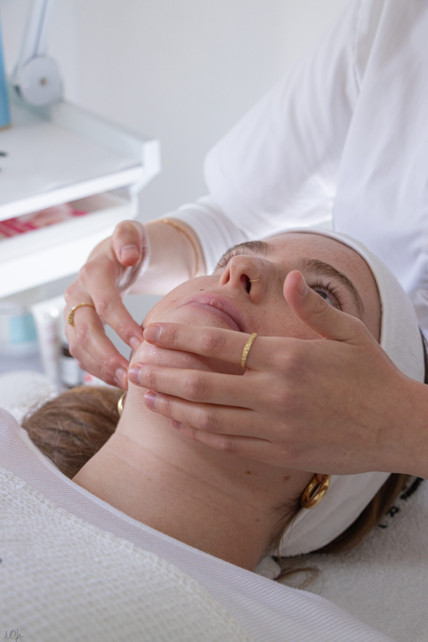 ניקוי יסודי, 2 פילנגים לפי סוג העור, עיסוי פנים ומחשוף, מסכה זהב ומסכת אצות, וסיום בקרם לחות והגנה.